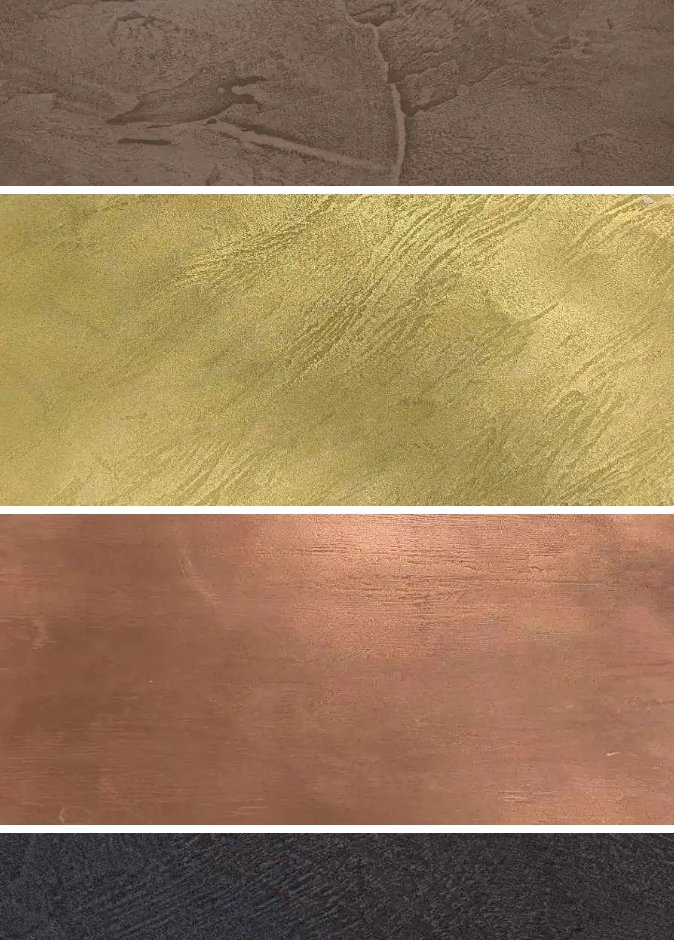金屬微水泥根據所選擇的顏料和金屬粉末等成分的不同,可以組合出各種不同的效果并且還可以在做出的金屬效果上,進一步處理形成氧化表面的視覺效果。